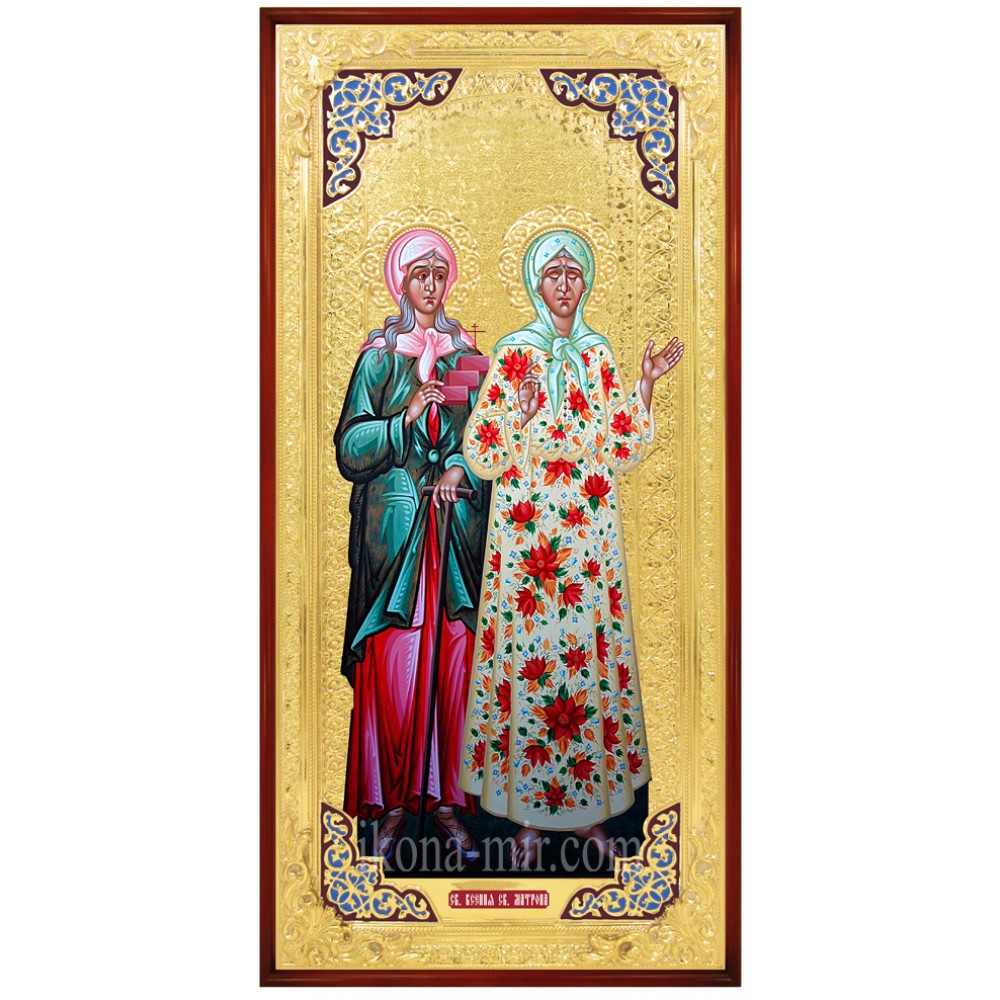Образ СВЯТИХ БЛАЖЕННИХ КСЕНІЇ ПЕТЕРБУРЗЬКОЇ ТА МАТРОНИ МОСКОВСЬКОЇ в стародавньому стилі виготовлений методом високоякісного поліграфічного друку.
